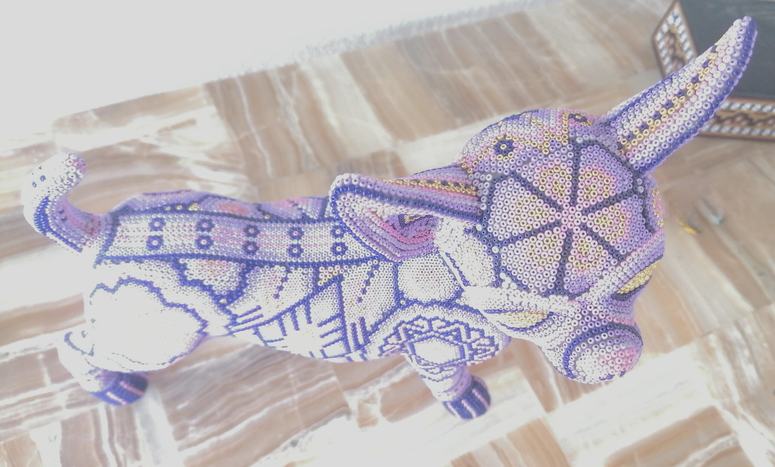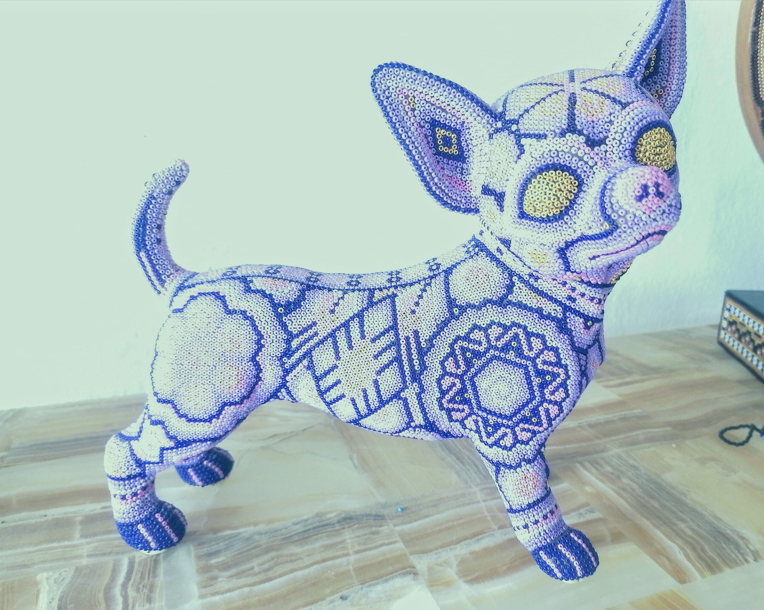 hermoso perro chaquira hecho en tonos violetas edidas 25×27 cms