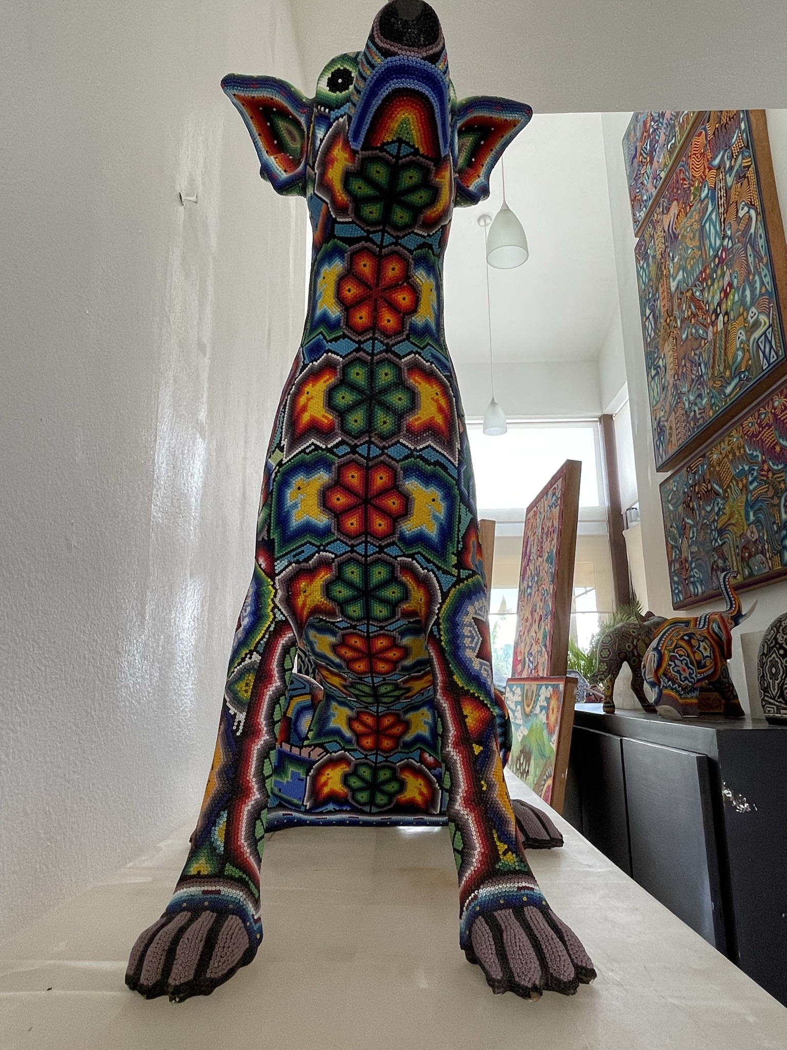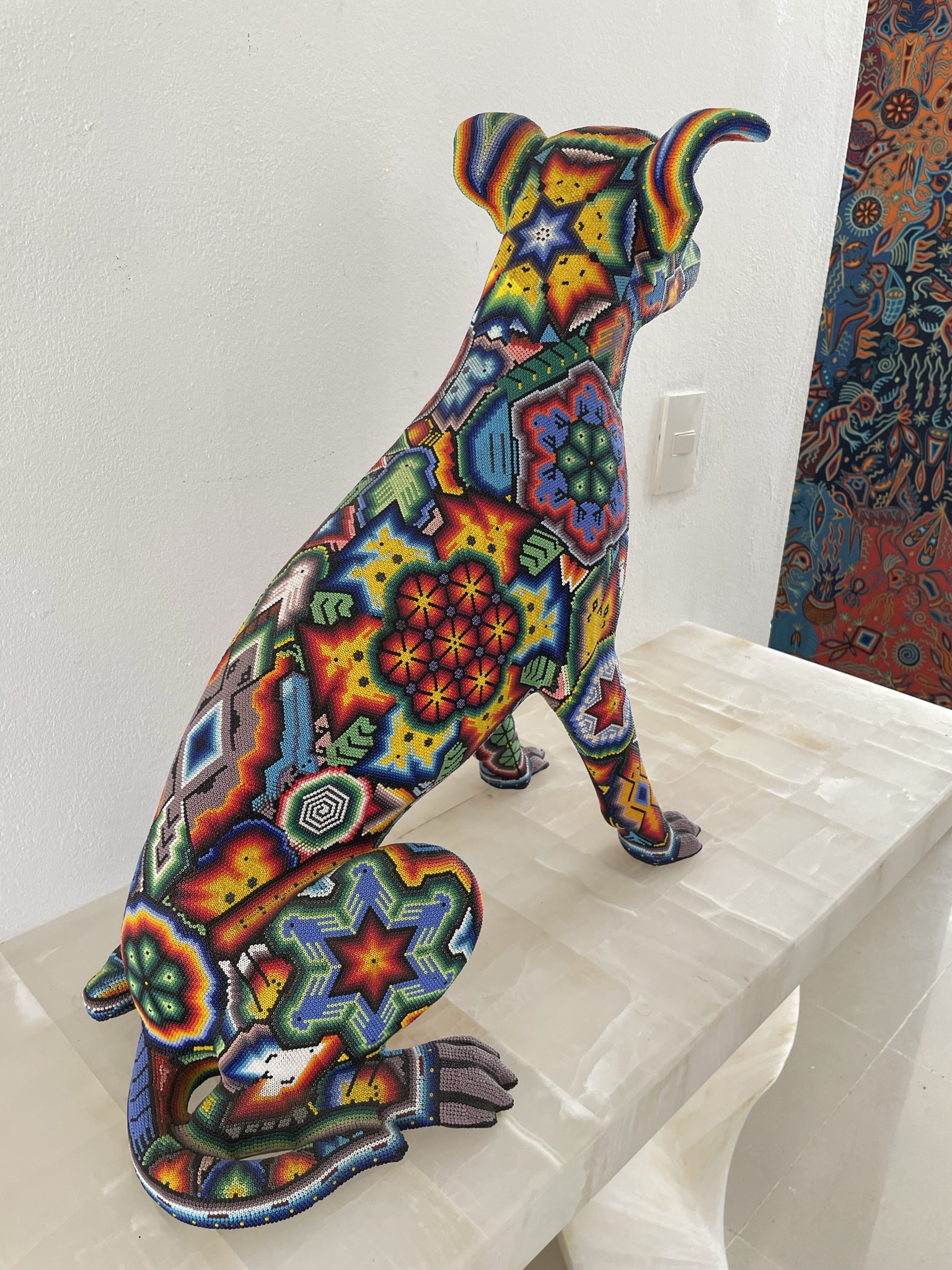 Es una pieza espectacular por sus dimensiones y por el excelente trabajo, artístico al plasmar el artista la simbología wixarika en la figura. Medidas 59 x 54 cm, tiempo de duración 4 meses. Se consideraron mas de 100,000 chaquiras para su elaboración.